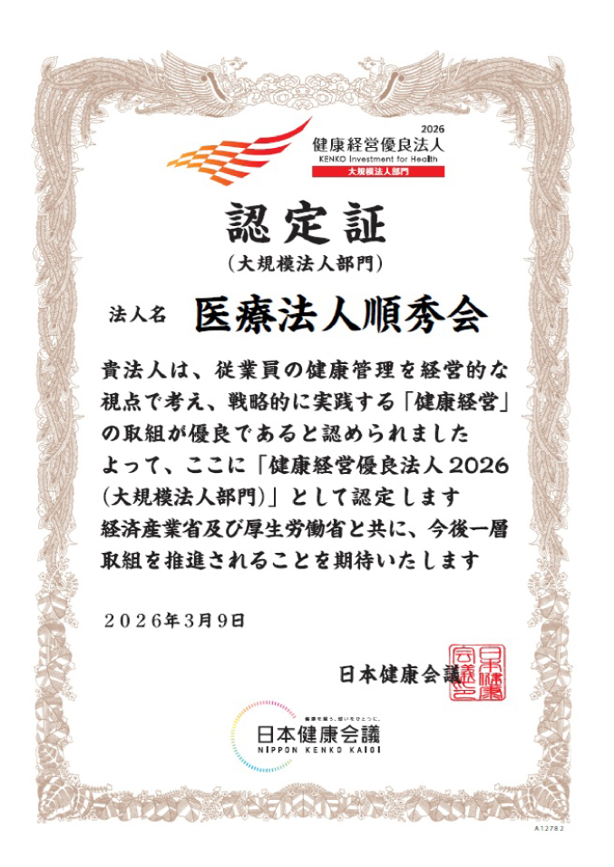 医療法人順秀会は設立60周年を迎えました。医療法人順秀会の基本理念「己のためではなく、他人のために生きること、それが医の本業である。」ことを全うするためには、まず従業員が生き生きとやりがいを持ち、かつ健康であることが必要です。従業員はじめ、その家族が心身共に健康でいることが、企業の発展のみならず地域住民の方や企業の方へより良い医療の提供につながると考えます。